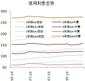 中长期信用债的利差变化不大,收益率上行主要受到基础利率上行的影响,利差仍然处于历史低位;短融率先调整,调整幅度至少在20BP,目前利差已经处于历史均值以上。