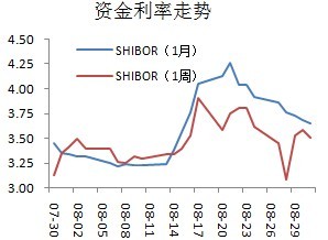 央行继续采取逆回购的方式应对银行间资金面的紧张局面,在8月下旬主动将7天逆回购的利率由3.35%提高到3.4%,并新增21天逆回购的申报,降准预期进一步减弱。