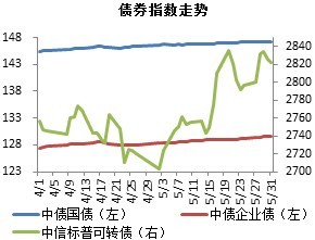 国债和企业债指数平稳上行;可转债指数在上半月有所反弹,5月下旬开始震荡走平。