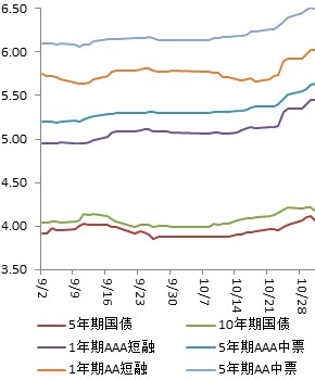 (2)10月中旬,债券一级市场供给大增,国债发行重启和政策性金融债放量叠加后,10月14日-10月20日当周利率债发行共14只,发行量达到1416.5亿元,超历史均值52%(年初以来周均发行930亿元)。