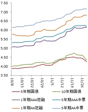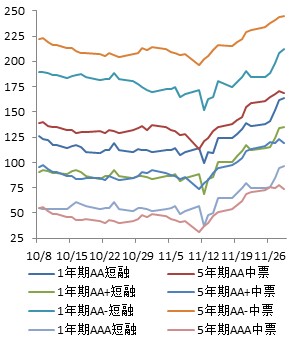 12月初,利率债与信用债保持同步小幅上行的走势,信用利差平稳;月末金融债收益率急速上行,利差有所回落。