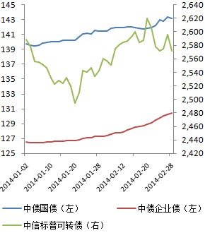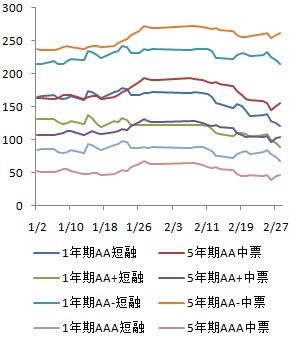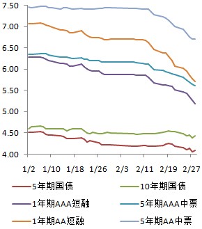 春节后,央行连续进行小量正回购操作,但资金面明显宽松,政府债券收益率小幅下行,短融和中票收益率下行幅度显著。