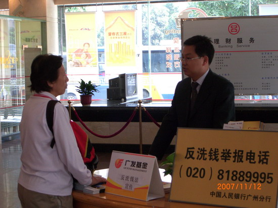 2007年11月11日,广发基金联合工商银行开展反洗钱街头宣传活动,设点宣传反洗钱法律法规、普及反洗钱基本知识。这也意味着广发基金为时一个月的反洗钱宣传活动正式启动。