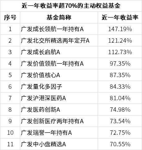 Wind数据显示,截至8月11日,广发成长领航一年持有A、广发北交所精选两年定开A和广发成长启航A等3只主动权益产品近一年实现业绩翻番,收益率分别达到147.19%、121.24%和112.73%。此外,广发价值领航一年持有A、广发价值核心A、广发量化多因子、广发沪港深医药A、广发医药创新A、广发创新医疗两年持有A、广发瑞誉一年持有A、广发中小盘精选A等8只产品同期业绩也超过70%。