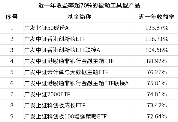 Wind数据显示,截至8月11日,聚焦北交所上市龙头的广发北证50成份A近一年斩获了123.87%的回报,广发中证香港创新药ETF及其联接A近一年回报分别达到118.71%、104.58%。此外,广发中证港股通非银行金融主题ETF及其联接A、广发中证云计算与大数据主题ETF、广发中证2000ETF、广发上证科创板成长ETF、广发上证科创板100增强策略ETF等产品近一年回报也超过70%。