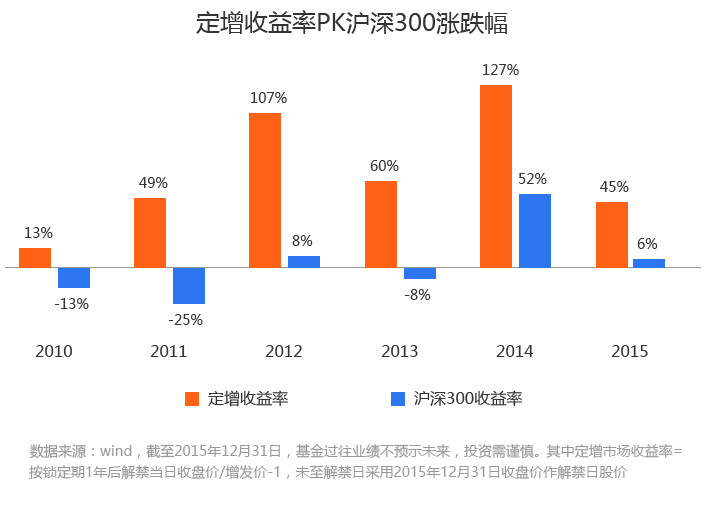2010年以来,定增项目每一年的收益率均在10%以上,远超同期沪深300指数。无论是在2010-2013年市场震荡期间,还是在2014-2015年的牛市,都能给投资者带来不错的回报。