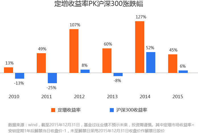 2010年以来,定增项目每一年的收益率均在10%以上,远超同期沪深300指数。无论是在2010-2013年市场震荡期间,还是在2014-2015年的牛市,都能给投资者带来不错的回报。