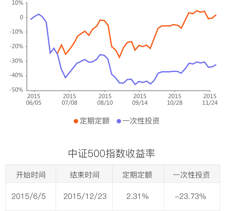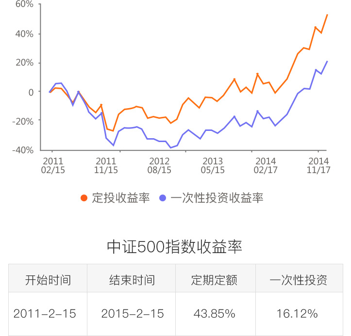 注:收益率根据同期Wind数据中证500指数点位计算,其中,定投收益率=(赎回日收盘点位*Σ当期投入金额/当期扣款日收盘点位-每期投入金额*期数) / (每期投入金额*期数)*100%;一次性投资收益率=(赎回日收盘点位-申购日收盘点位)/ 申购日收盘点位*100%。风险提示:基金过往业绩不预示未来表现,投资需谨慎。