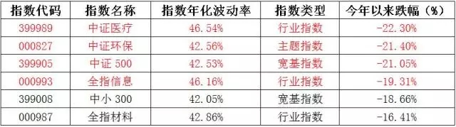 顺着这个逻辑,先去挖掘今年开始至6月波动率大的指数。理论上波动大的指数,它反弹的力度也会更多,所以可以先关注年化波动率超过42%的指数。
