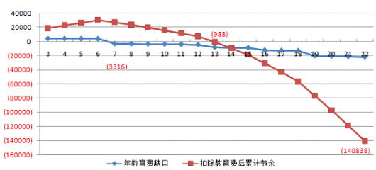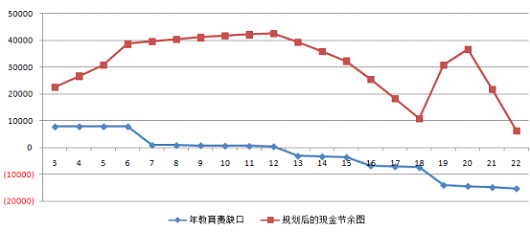 从图1中蓝色的曲线可以看到,在孩子7岁时当年会出现现金流缺口(即当年的现金流入不足以支付现金流出),不过这种缺口可以用孩子7岁以前的节余资金弥补。但即便这样,从红色的曲线可以看到,在孩子13岁时仍会出现教育资金不够的困境。从孩子13岁-22岁期间,教育费用总的现金缺口为140838元。