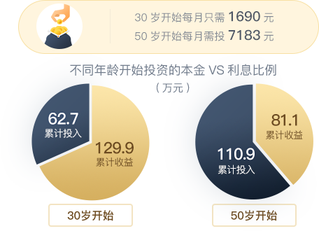 假设退休后每月支出8000元,65岁退休至85岁期间共需要花费192万元。由于复利效应,越早开始规划,经济负担越小。