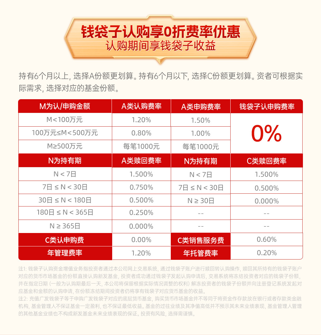 钱袋子认购享0折费率优惠,认购期间享钱袋子收益