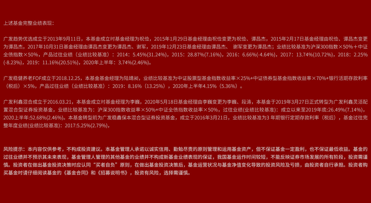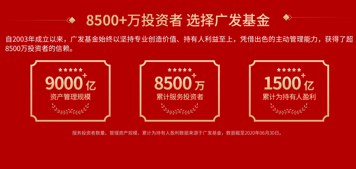 风险提示:银河证券数据中心,截至--.--.--。广发高端制造股票成立于2017.09.01,广发新经济成立于2013.02.06,广发利鑫混合成立于2016.03.21,广发稳健增长混合成立于2004.07.26。广发稳健增长评级数据来源于银河证券,获银河证券三年期、五年期双五星评级,截至2020年6月30日,持有人数量来源于基金定期报告。基金过往业绩不预示未来表现,投资有风险,选择需谨慎。
