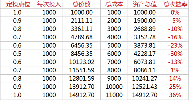 产品价格从1元到0.5元再到1元,一次性投入的回报是0,定投的回报居然有36%;1元买的产品,跌到0.5元只亏了30%,0.7元的时候居然已经开始盈利了。