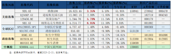 上周,标普500指数上涨2.49%,纳斯达克指数上涨2.85%。上周美联储12月FOMC会议“官宣”加息周期结束,进一步确认了市场的交易方向,美债利率高位明显回落,短期市场流动性边际好转,纳斯达克涨幅靠前。往后看,当前美国经济仍存韧性,通胀预期反复,市场定价的美联储乐观降息空间或存在反复,后续关注利率变化对估值的影响。