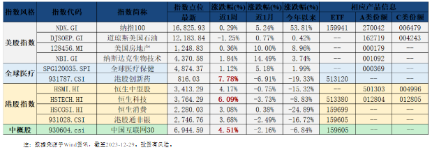 港股2023年最后一周以大涨收尾,恒生指数涨4.33%、恒生科技涨6.09%。港股短期看或缺少明确催化,但从中期维度来看,当前港股同样处在相对低估值的区域,且更加受益于海外流动性的转向,建议关注盈利端兑现度较高、估值端对海外流动性敏感的行业。