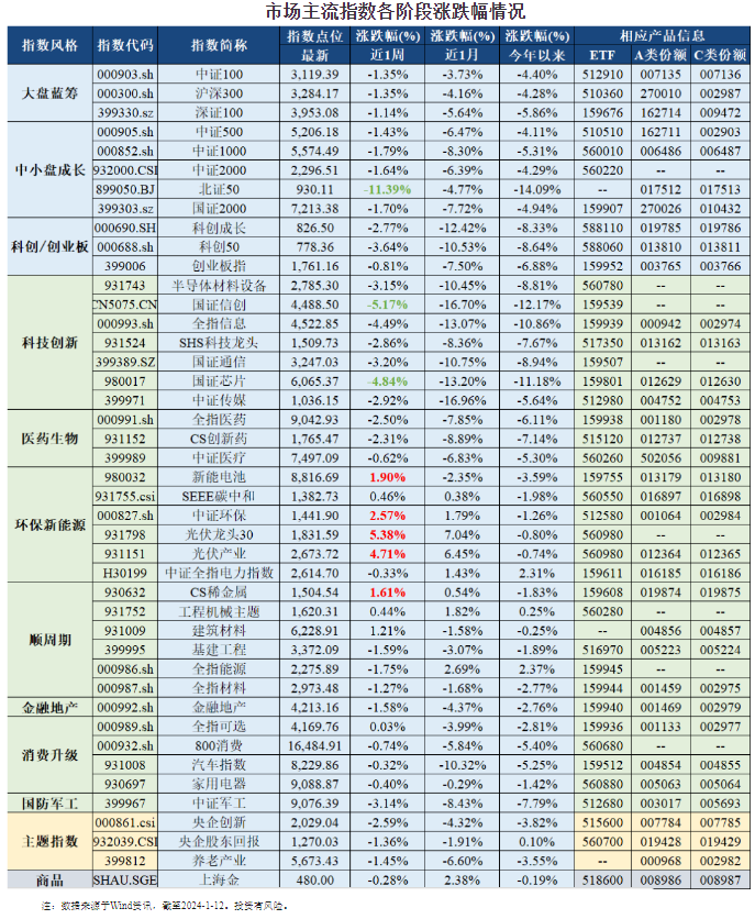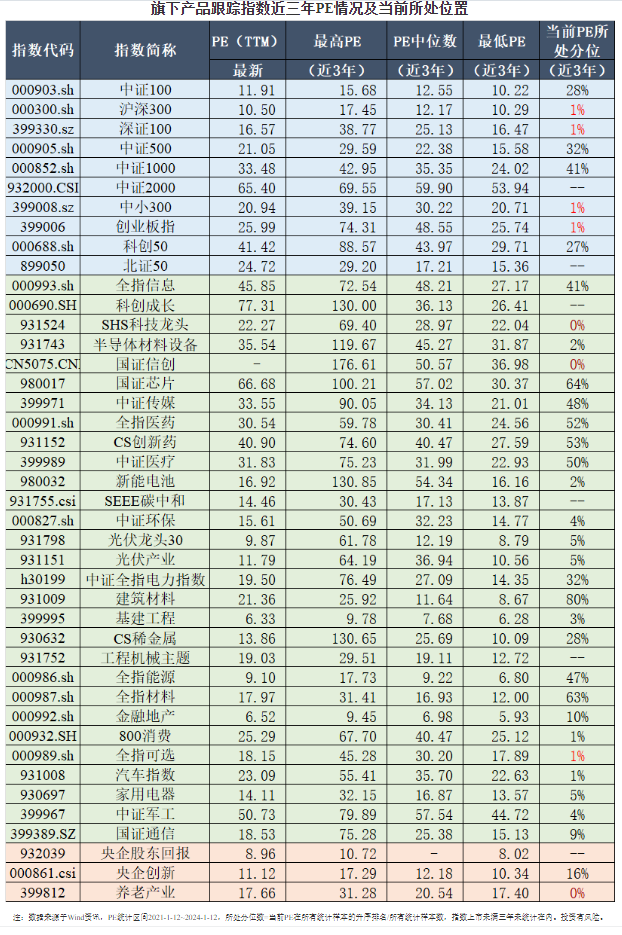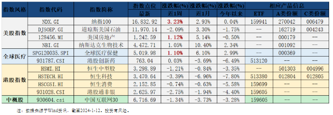 海外市场方面:截至1月12日,纳指100指数表现最好,涨跌幅为3.23%;恒生科技指数表现最差,涨跌幅为-3.39%。
