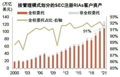 从管理模式来看,客户把决策权完全交给买方投顾的全权委托模式,占比高达91%。这代表着,客户高度信任买方投顾的专业度,把所有的投资决策都交给了他们。