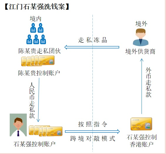 江门石某强洗钱案中,钱庄石某强在未经国家有关主管部门批准的情况下,非法经营外汇兑换业务,2019年初至2020年9月期间,在明知陈某贵从事走私犯罪的情况下,使用其在境内控制的银行账户收取陈某贵转入的人民币,按照约定的汇率折算,再通过其控制的香港银行账户将相应的美元转入陈某贵提供的境外供货商银行账户中,共计人民币6829.62万元。