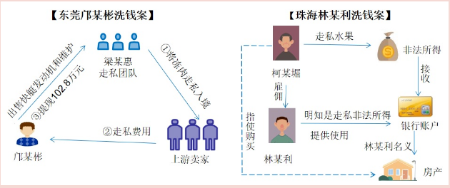 东莞邝某彬洗钱案中,邝某彬收到上家汇入的走私费用后,扣减其为快艇维护服务费后,从银行账户提取现金交还走私团伙,掩饰隐瞒走私团伙所得的资金去向,套取现金共计102.8万元;珠海林某利洗钱案中,林某利受柯某堀指使,提供自己银行账户接收柯某堀走私违法犯罪所得资金,为掩饰、隐瞒资金来源和性质,以林某利名义签订购房合同并登记为其名下不动产。
