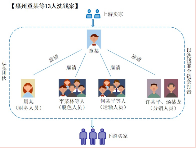 自2018年12月起,童某等人明知红油是走私入境的货物,仍收购后组织人员进行脱色、运输等,然后将走私入境红油经脱色加工所成的柴油在国内销售获利,掩饰、隐瞒了走私犯罪所得的来源和性质,其行为构成洗钱罪。2022年3月11日,惠州市中级人民法院依法对童某等13人犯洗钱罪案作出终审裁定,判处有期徒刑七年至一年六个月不等,罚金人民币393万元。