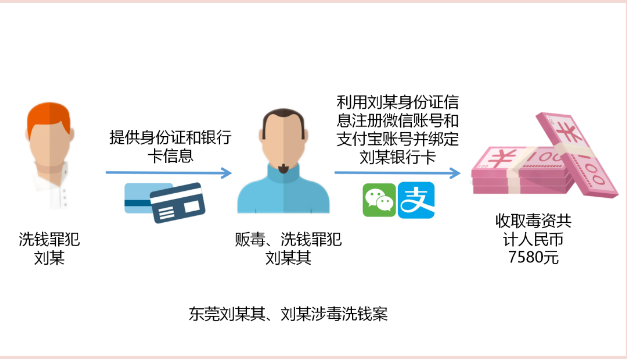 2016年5月份开始,刘某其为掩饰其毒资的来源和性质,借用刘某的身份证信息注册微信账号和支付宝账号,并用刘某的银行账户绑定上述账号,通过上述微信账户和支付宝账号用于联系吸毒人员并收取毒资,刘某明知刘某其从事毒品交易行为,仍然将上述身份证信息和银行账户借给刘某其使用。刘某其利用刘某的上述账号和银行卡收取毒资共计7580元。2022年7月,东莞市第二人民法院判决刘某其犯贩卖、运输毒品罪,判处有期徒刑七年,并处罚金10000元;犯洗钱罪,判处拘役六个月,并处罚金2000元,数罪并罚决定执行有期徒刑七年,并处罚金12000元。判决刘某犯洗钱罪,判处拘役六个月,并处罚金2000元。其中,刘某其为自洗钱。