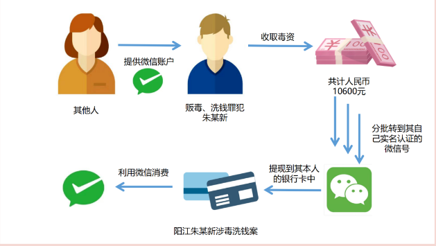 阳江朱某新洗钱案中,朱某新将收到的毒资分批转到其自己实名认证的微信号并提现到其本人的银行卡中,再通过其自己实名认证的微信号支出使用。