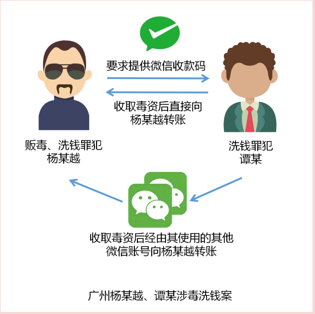 广州杨某越、谭某洗钱案中,谭某明知杨某越贩卖毒品,仍提供微信收款码并在收取毒资后直接或经由其使用的其他微信账号向杨某越转账,掩饰资金来源及性质。