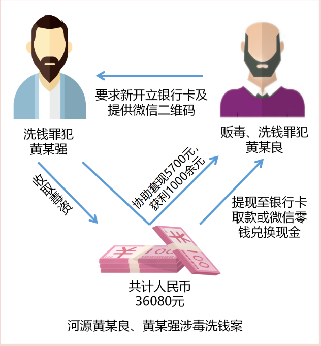惠州肖某中、肖某粦洗钱案中,肖某粦利用肖某中微信账户接收毒资26695元,然后再将毒资通过微信转账及银行卡提现的方式转至其本人。河源黄某良、黄某强洗钱案中,黄某强提供银行帐户及微信二维码帮助黄某良收取毒资36080元,并协助套现5700元给黄某良,其余毒资由黄某良提现至银行卡取款或微信零钱兑换现金。