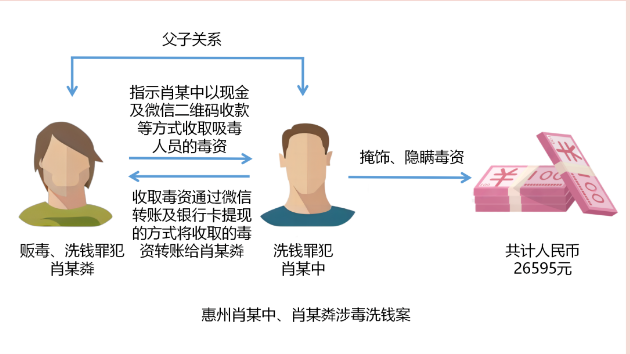 2021年12月份开始,肖某中在明知其父肖某粦是贩毒人员的情况下,依照肖某粦的指示多次帮肖吉粦以现金及微信二维码收款等方式在收取吸毒人员的毒资后,通过微信转账及银行卡提现的方式将收取的毒资转账给肖某粦。肖某中帮助肖某粦掩饰、隐瞒毒资共计人民币26595元。2022年8月,惠城区人民法院判决肖某中犯洗钱罪,判处有期徒刑一年八个月,并罚金10000元。判决肖某粦犯贩卖毒品罪,判处有期徒刑七年三个月,并处罚金80000元;犯洗钱罪,判处有期徒刑一年八个月,并处罚金10000元;数罪并罚决定执行有期徒刑八年七个月,并处罚金90000元。其中,肖某粦为自洗钱。