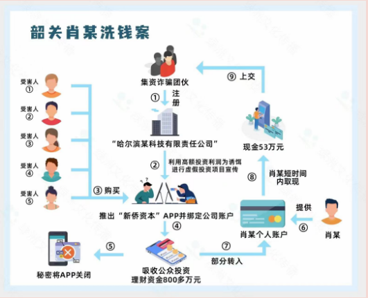 2018年7月,集资诈骗团伙通过注册公司、网络推送手机APP等方式,以高额投资利润为诱饵进行虚假投资项目宣传,吸收公众投资理财资金800多万元,2019年11月,集资诈骗团伙将APP关闭,致使受害人投资款被骗。肖某为将集资诈骗资金转换为现金,将自己的银行账户提供给诈骗团伙,待诈骗资金转账至提供的银行账户后,再将账户内的资金取现,取现金额为人民币53万元。2022年8月,韶关市始兴县人民法院判决肖某犯洗钱罪,判处有期徒刑一年十个月,并处罚金4万元。