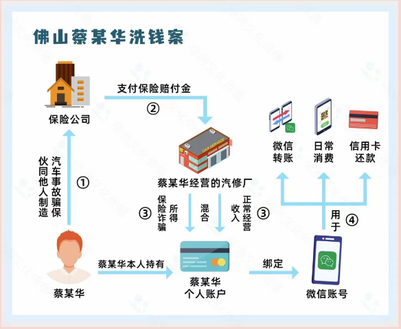 在佛山蔡某华洗钱案中,蔡某华利用其自身经营的汽修厂对公银行账户接收保险诈骗资金后,随后将该笔款项转入其个人账户,并通过绑定的微信账号,用于个人微信转账、日常消费及信用卡还款,通过将诈骗所得与其经营收入相混合的方式,将诈骗所得转换为个人合法财产,掩饰、隐瞒保险诈骗犯罪所得的来源和性质。