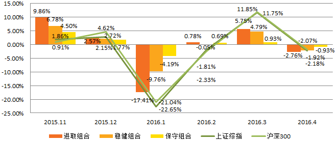 行业方面,各行业涨跌幅发生了比较大的差异,采掘、钢铁、家用电器、食品饮料、银行等行业四月获得正收益,而国防军工、计算机、传媒等则发生比较大的跌幅。