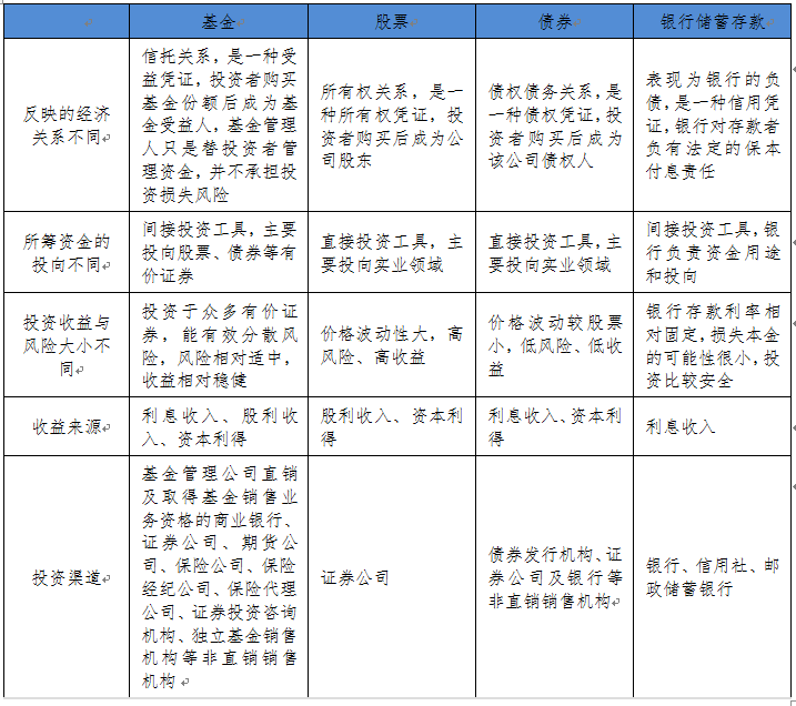 (二)基金与股票、债券、储蓄存款等其它金融工具的区别