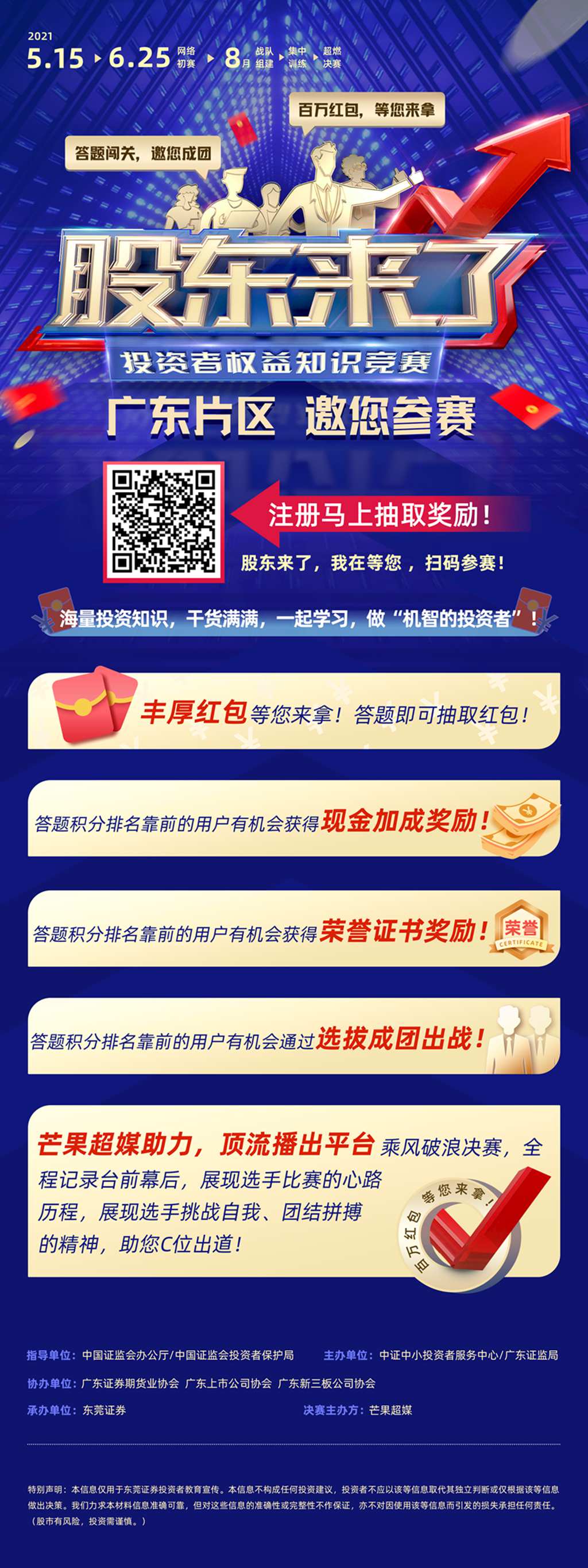 2021投资者权益知识竞赛开始啦!由中证中小投资者服务中心、广东证监局等联合主办,全国六大片区,覆盖36个赛区及港澳台地区,面向广大中小投资者普及权益知识。活动正火热开展中,初赛以网络答题形式开展,初赛成绩优胜者有机会参与所属片区战队成员选拔;电视决赛将于9月通过湖南卫视、芒果TV播出。扫码参赛吧!