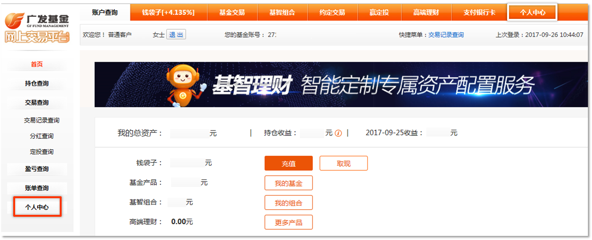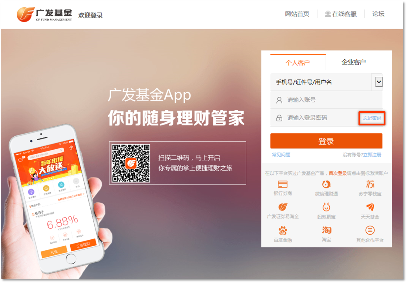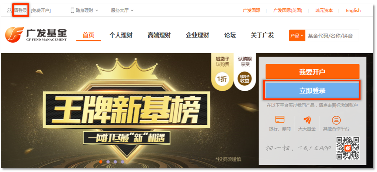 1、打开广发基金官方网站(www.gffunds.com.cn)首页,点击左侧顶端“请登录”或者右侧“立即登录”。