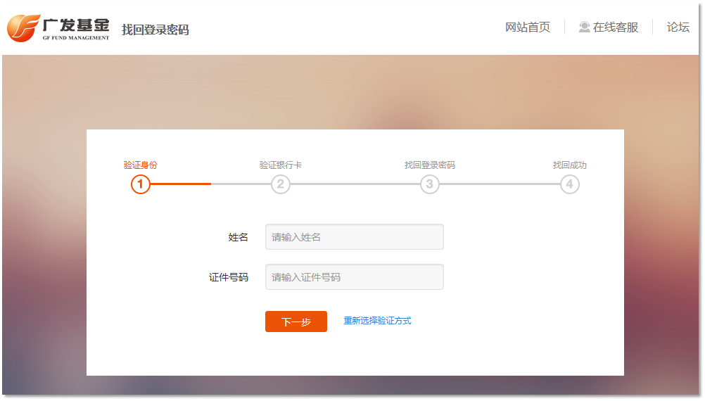 8、若手机号码无法使用,可选择通过银行卡验证重置,点击对应重置按钮,在下一页面输入姓名和证件号码,点击“下一步”。