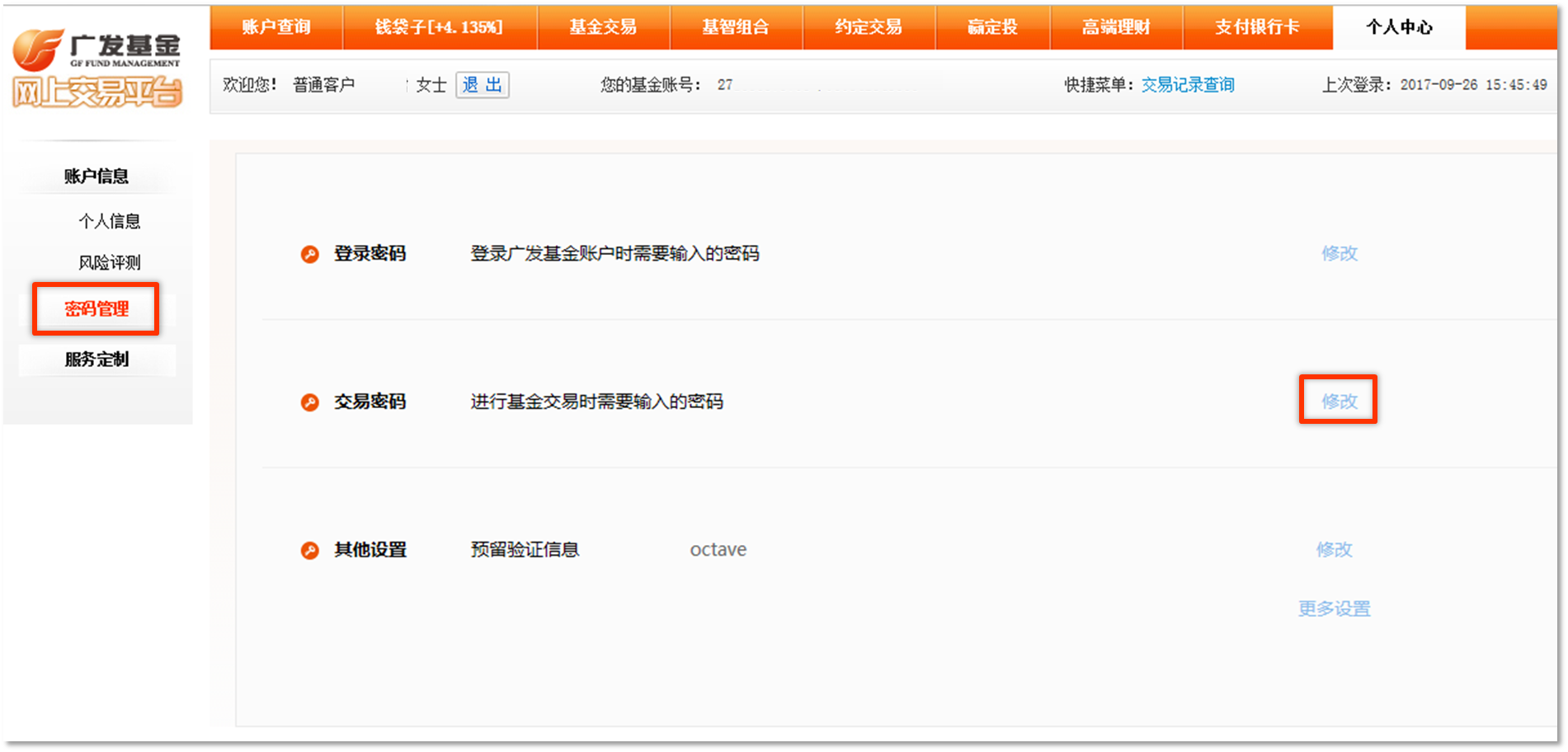2、进入【密码管理】栏目,点击交易密码右侧的“修改”。
