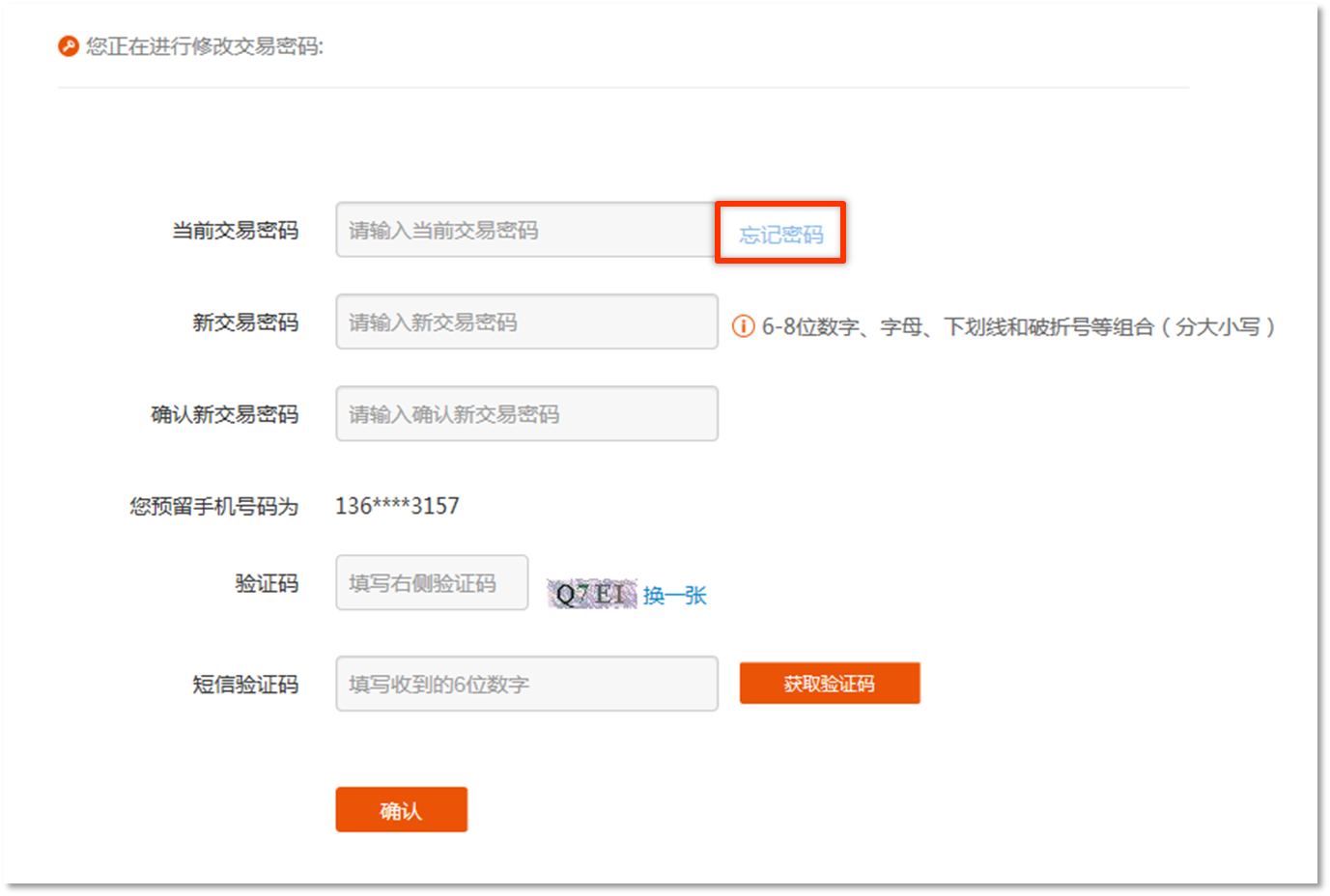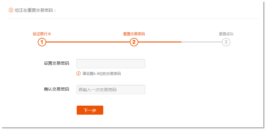 4、按页面提示规则重新设置交易密码,再次输入确认后点击“下一步”。