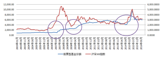 下表是2003年以来股票型基金份额变动和沪深300指数的对比图