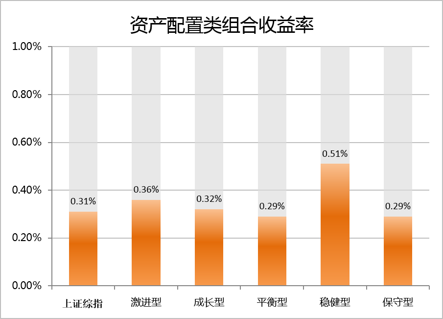 投研精选组合:权益类100%,其中广发多因子混合17.67%,广发新经济混合C17.12%,广发创新驱动混合15.39%,广发价值领先混合14.76%,广发电子信息传媒A9.59%,广发资源优选A8.40%,广发品牌消费C8.27%,广发医疗保健A4.52%,广发金融地产联接C4.28%。维持配置不变。
