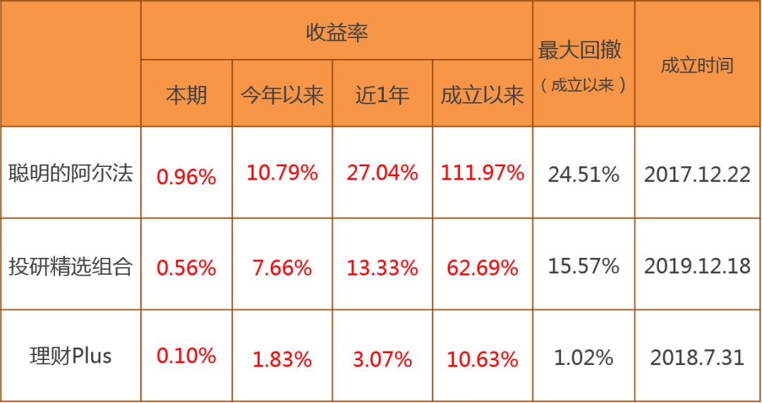 聪明的阿尔法:权益类100%,其中广发科技创新11.64%,广发鑫益混合11.19%,广发创新升级混合10.54%,广发新兴产业混合A10.39%,广发多因子混合10.30%,广发新经济混合9.78%,广发竞争优势9.18%,广发沪港深新起点A9.06%,广发核心精选9.04%,广发价值领先8.88%。维持配置不变。