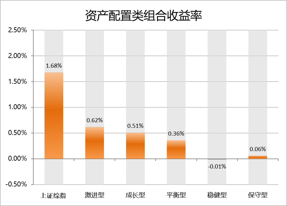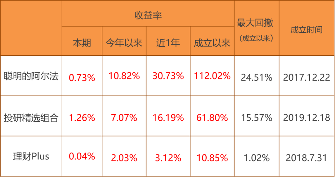 聪明的阿尔法:权益类100%,其中广发科技创新12.35%,广发鑫益混合10.95%,广发多因子混合10.84%,广发新兴产业混合A10.60%,广发创新升级混合10.45%,广发新经济混合9.54%,广发核心精选9.05%,广发沪港深新起点A8.90%,广发价值领先8.79%,广发竞争优势8.53%。维持配置不变。