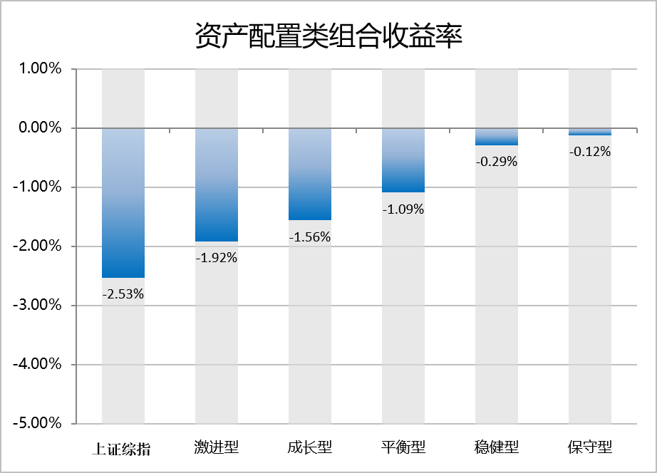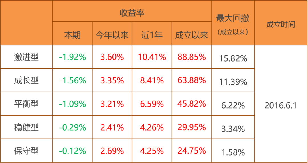 投研精选组合:权益类100%,其中广发多因子混合19.02%,广发新经济混合C16.43%,广发创新驱动混合15.68%,广发价值领先混合14.44%,广发电子信息传媒A9.75%,广发资源优选A8.85%,广发品牌消费C7.37%,广发金融地产联接C4.41%,广发医疗保健A4.05%。维持配置不变。