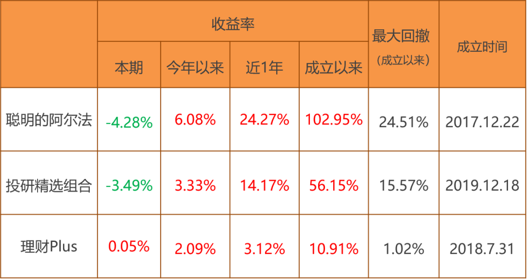 聪明的阿尔法:权益类100%,其中广发科技创新12.58%,广发鑫益混合11.31%,广发多因子混合11.11%,广发新兴产业混合A10.63%,广发创新升级混合10.42%,广发新经济混合9.41%,广发核心精选9.14%,广发价值领先8.71%,广发沪港深新起点A8.60%,广发竞争优势8.09%。维持配置不变。