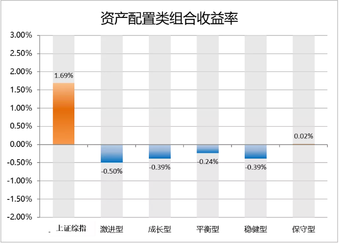 投研精选组合:权益类100%,其中广发多因子混合20.13%,广发创新驱动混合16.00%,广发价值领先混合15.08%,广发新经济混合C14.96%,广发资源优选A9.34%,广发电子信息传媒A8.94%,广发品牌消费C7.36%,广发金融地产联接C4.44%,广发医疗保健A3.75%。维持配置不变。