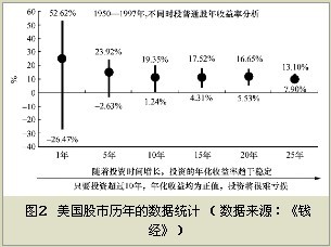此外,在图2中从美国股市历年的数据统计中可以发现,一方面能够看到当投资时间超过10年后,其最低收益与最高收益均为正值。也就是说,只要投资者的投资时间超过10年,那么无论投资者在熊市或牛市入市,也无论投资期间经历了怎样的市场变化,他的投资发生亏损的可能性较小。图2中的对应投资时间为10年 [1.24%,19.35%]、15年[4.31%,17.52%]、20年[5.53%,16.65%]、25年[7.90%,13.10%]几个区间。