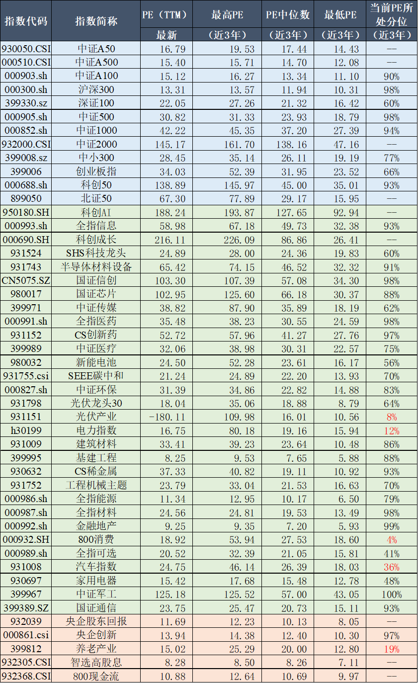 旗下产品跟踪指数近三年PE情况及当前所处位置
