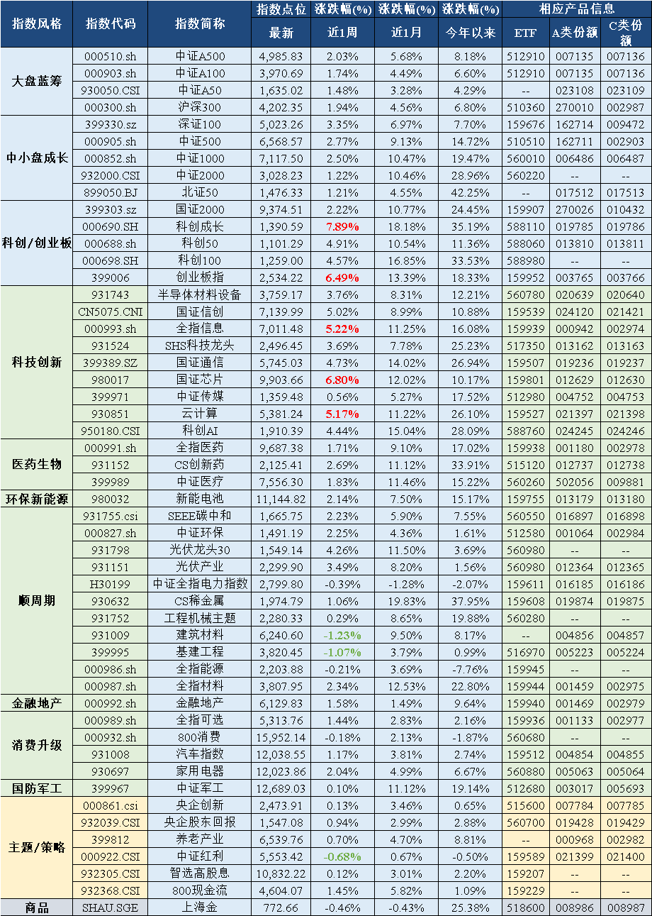 主流指数中,科创成长上涨7.89%,表现最好;建筑材料下跌1.23%,表现最差。