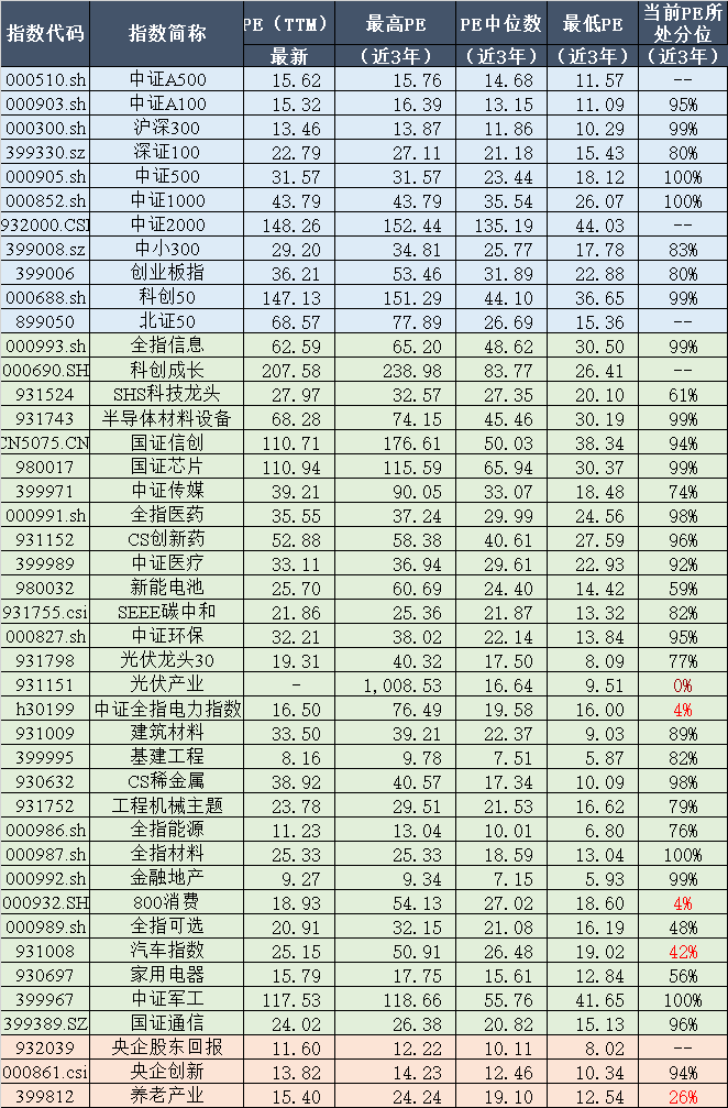 旗下产品跟踪指数近三年PE情况及当前所处位置